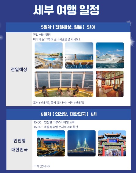 매일 방 펼쳐지는 다양한 공연 및 선내 프로그램 관람 (일부 유료 프로그램 제외)